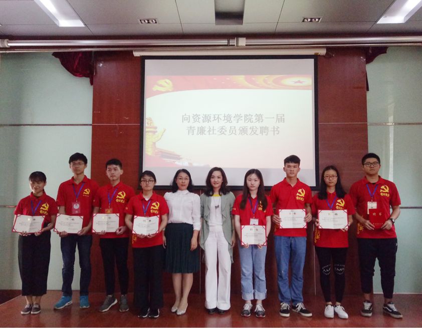 随后,资源环境学院党委书记周艳华宣布了青廉社成立并宣读委员任命决定,并与罗主任一道为资环青廉社第一届委员颁发聘书。